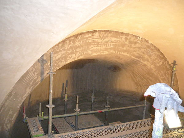 Zustand 26.09.2012: Blickrichtung in das obere Apsisgewölbe.Der Oberputz des Chorgewölbes wird gerade fertiggestellt, ist aber noch feucht, in der Apsis sieht man noch den Unterputz.
