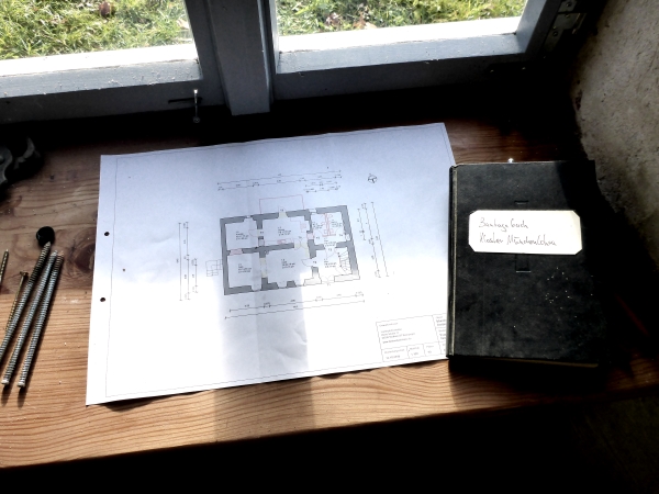 Herausreißen des Fußbodens begonnen und das Fundament für den neuen Schornstein ausgehoben (nebenstehendes Bild).