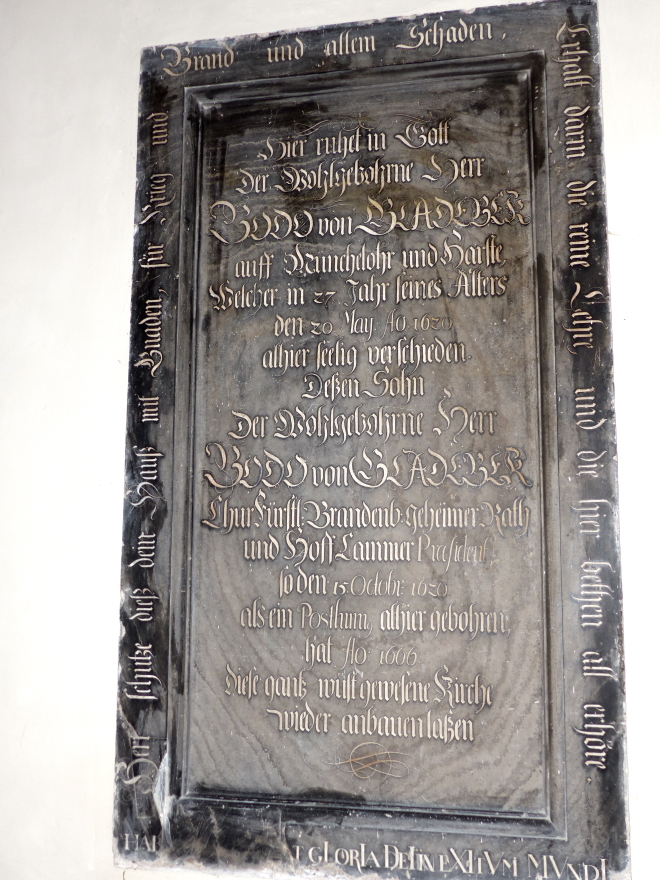 Hier ruhet in Gott/der Wohlgeborne HerrBODO von GLADEBECK/auff Münchenlohr und Harste...... hat A(nn)o 1666 / diese gantz wüst gewesene Kirchewieder anbauen laßen