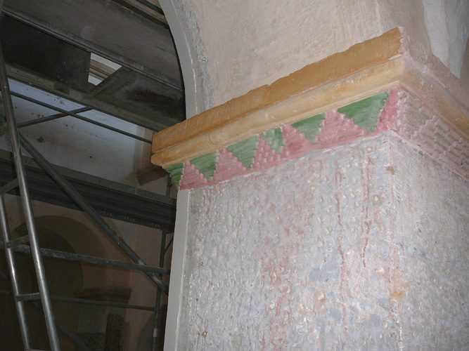 der Fries am Kämpfer des Pfeilers hatte auch grüne Farbpartikel aus der Zeit der Restaurierung vorzuweisen.